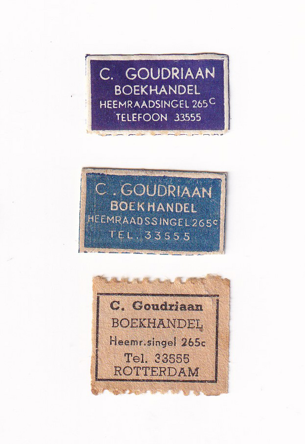 Cornelis Goudriaan nam in 1921 de leesbibliotheek over van Joh. H. Stegman in de Kruisstraat nr. 53 in Rotterdam. Stegman had aanvankelijk een sigarenhandel maar voegde daar later een leesbibliotheek aan toe. Goudriaan voerde binnen een aantal jaren het boekbestand flink op van 15.000 naar 25. 000 meest nieuwe titels. “De grootste leesbibliotheek in het centrum der stad”. Hij gaf aparte catalogi uit met jongens- en meisjesboeken. Maar daarnaast ontwikkelde de zaak zich tot een echte boekhandel, kantoorboekhandel, advertentiebureau en binderij. Men kon er ook visitekaartjes laten drukken. Het pand aan de Kruisstraat werd ongetwijfeld getroffen door het bombardement in mei 1940. Maar in 1942 meldt Goudriaan “weder geopend” te zijn, nu op de Heemraadssingel nr. 265a (in het plantsoen). Boekhandel Goudriaan heb ik kunnen traceren tot 1951.
